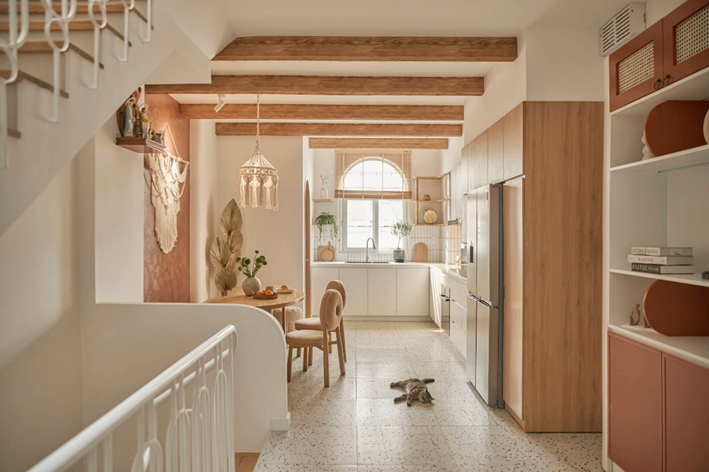 Sử dụng các gam màu ấm như trắng, be, vàng nhạt, đất nung kết hợp với tông xanh nước biển hoặc xanh olive tạo cảm giác dịu mát và dễ chịu.
