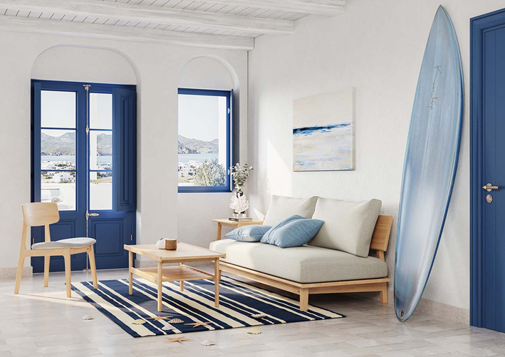 Nó có nhiều điểm tương đồng với phong cách nội thất đồng quê, nhưng sử dụng màu sắc và vật liệu để tạo ra một không gian yên bình và thư thái. Tuy nhiên, nhìn chung, phong cách nội thất Địa Trung Hải có xu hướng chọn nội thất mang tính thẩm mỹ hiện đại, tiện nghi.