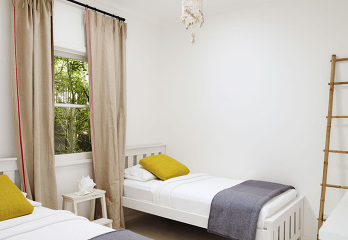 Ngoài phòng ngủ chính dành cho gia đình, gia chủ còn yêu cầu bố trí thêm không gian nghỉ ngơi dành cho khách vào các dịp lễ tết, nghỉ ngơi đặc biệt. Tại đây, phòng dành cho khách có hai giường đơn và đều có thêm vỏ gối và chăn với tone màu đậm vô cùng nổi.